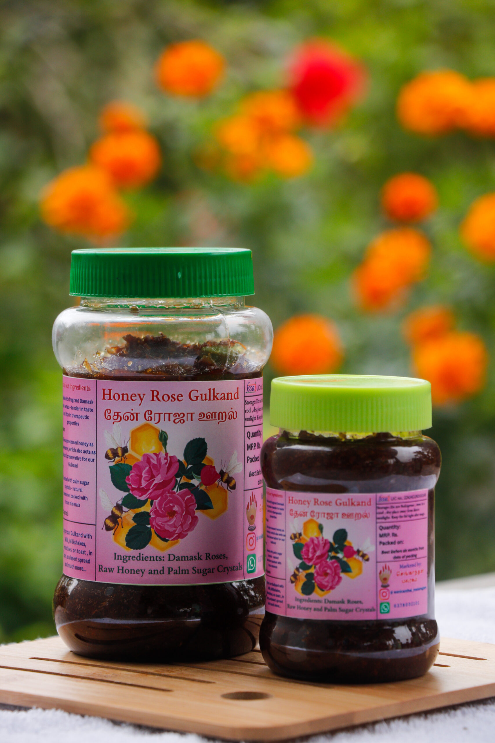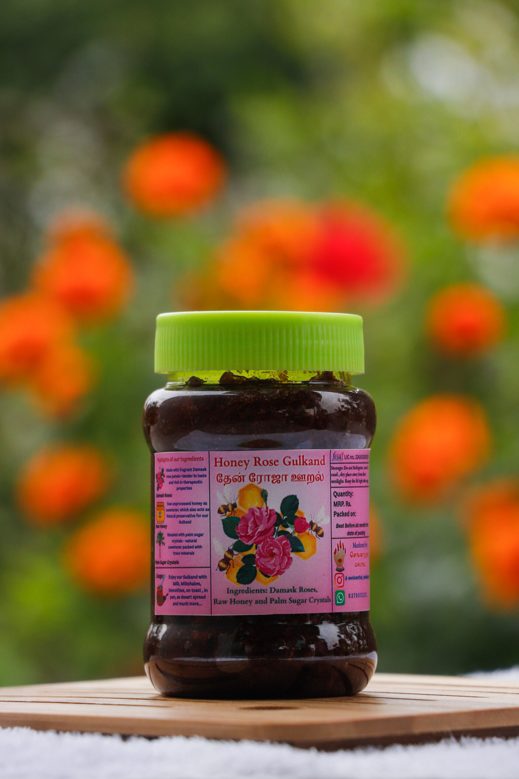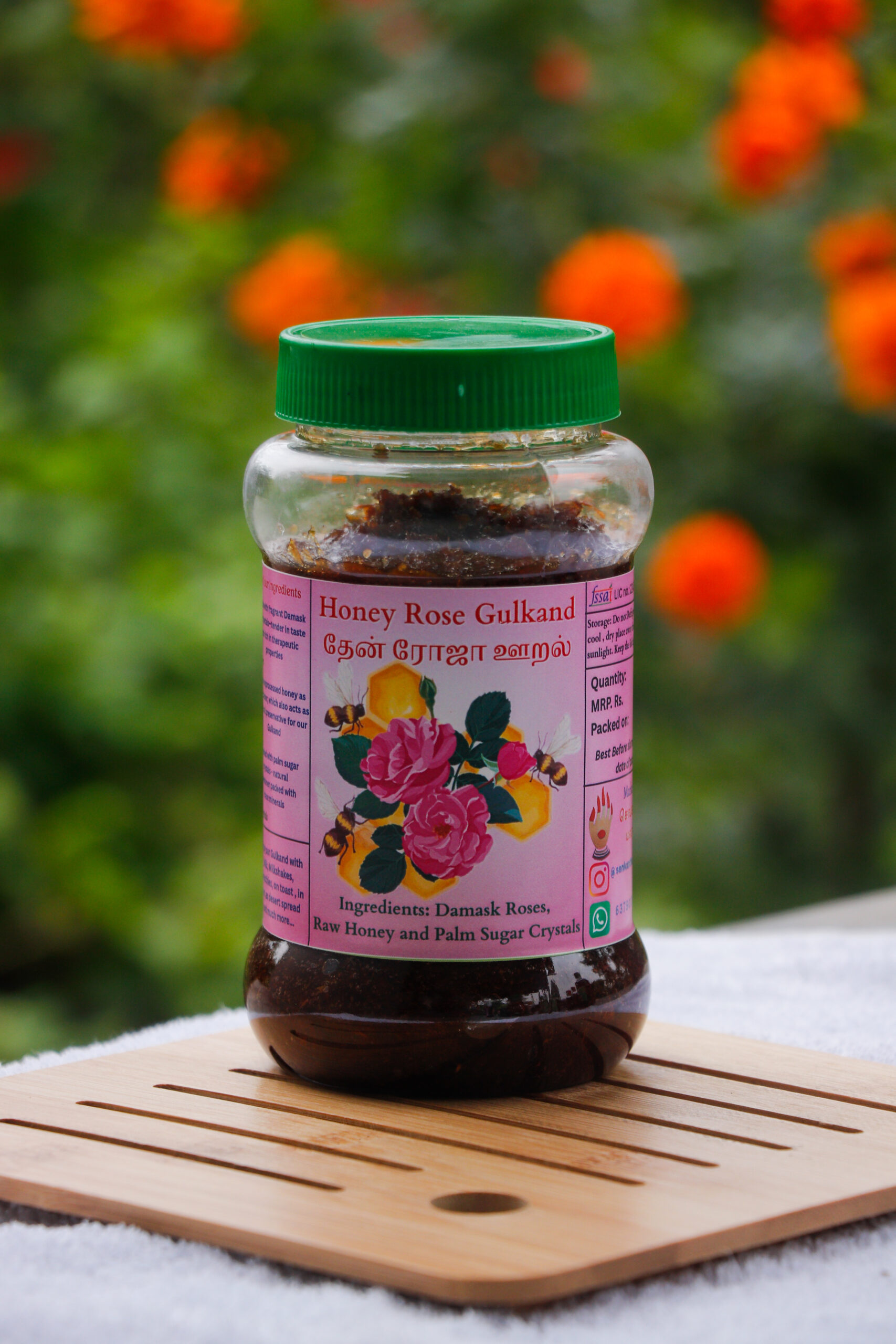 Honey Rose Gulkand is a luxurious Ayurvedic delicacy crafted from fresh Damask Roses, slowly infused with raw forest honey and natural palm sugar crystals. This premium blend brings together the cooling, therapeutic essence of handpicked roses with the nutrient-rich sweetness of honey and palm sugar — creating a delicious, aromatic, and health-boosting superfood.